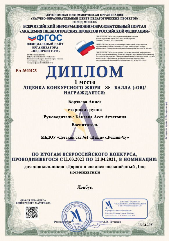 Воспитанница старшей группы Борзаева Аниса и воспитатель старшей группы Бакаева А.А. награждены дипломом за I-место в всероссийском конкурсе проводившегося с 11.03.2021 по 12.04.2021 в номинации: "Дорога в космос".
