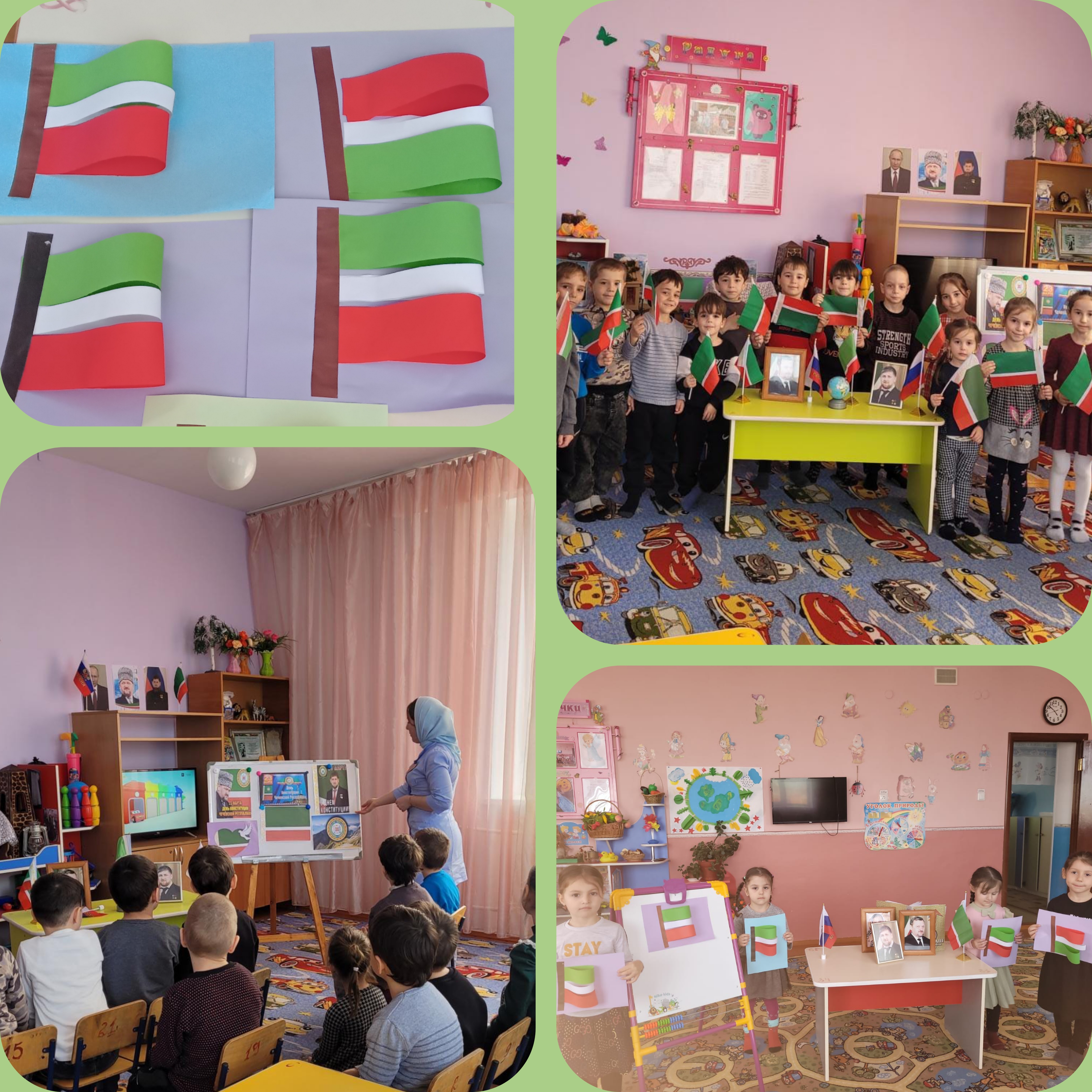 В рамках празднования Дня Конституции Чеченской Республики с детьми старшего дошкольного возраста были проведены занятия и беседы по нравственно-патриотическому воспитанию детей,а так же была оформлена выставка детских работ.