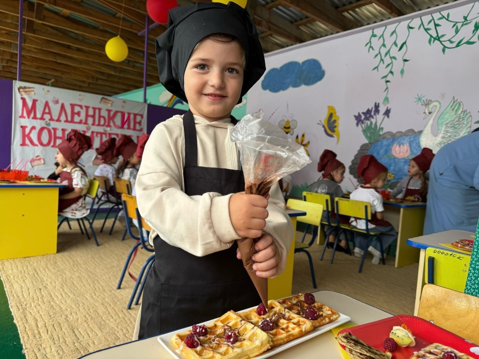 Воспитатель старшей группы “Солнышко” Азиева Зарема провела мероприятие «Маленькие кондитеры». Цель: познакомить детей с профессией кондитера и процессом приготовления Венский вафель.