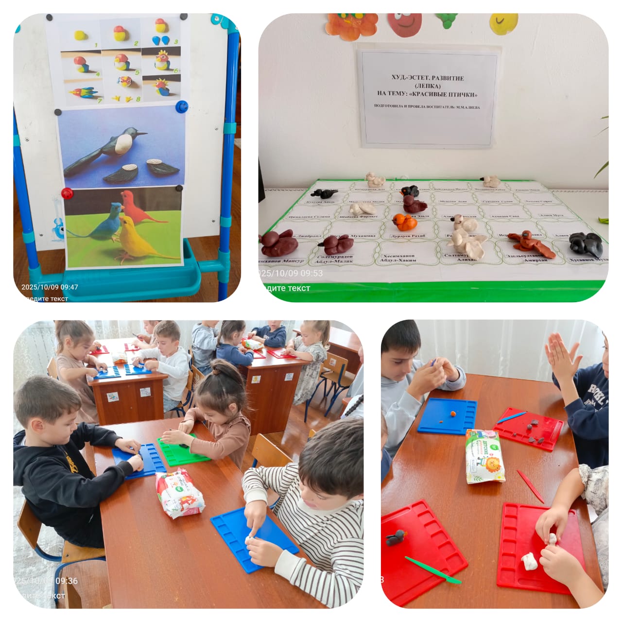 09.10.2025В МБДОУ «ДЕТСКИЙ САД» ИРС» «СТ. КУРДЮКОВСКАЯ» с воспитанниками старшей группы "Звездочка" проведено занятие по «Художественно-эстетическому развитию» (лепка) на тему: "Красивая птичка"Цель: учить передавать в лепке образ птицы, передовая правильную форму частей тела, клюв, голову, хвост, крылья.