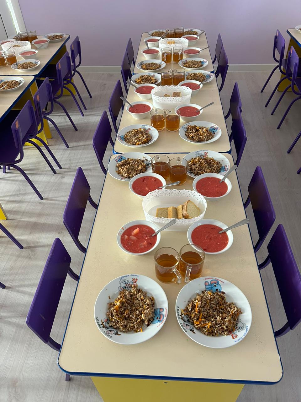 В детском саду детей кормят по разработанному меню, которое включает завтрак, обед, полдник и ужин. Основу рациона составляют каши, молочные продукты, мясо, рыба, птица, овощи, фрукты, злаки и хлеб.