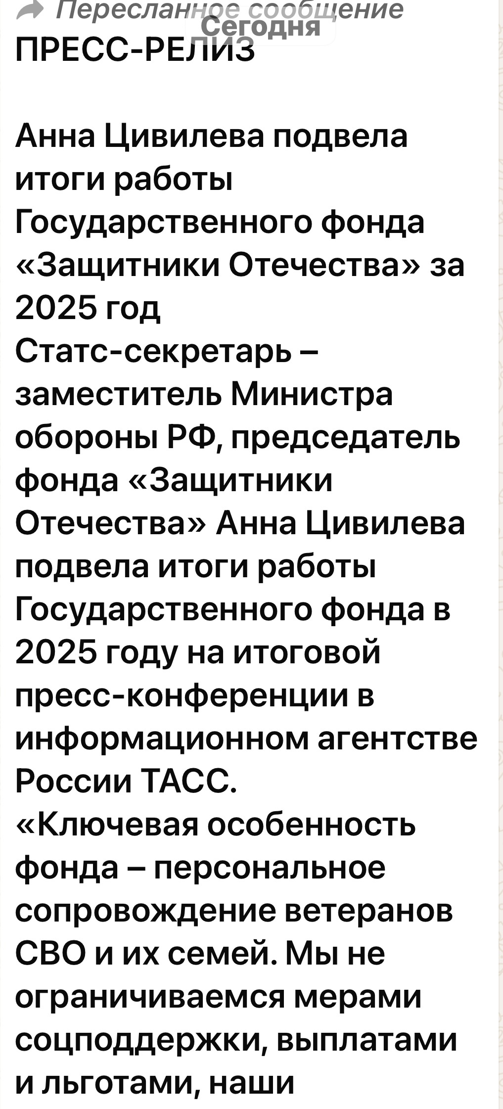 Статс-секретарь – заместитель Министра обороны РФ, председатель фонда «Защитники Отечества» Анна Цивилева подвела итоги работы Государственного фонда в 2025 году на итоговой пресс-конференции в информационном агентстве России ТАСС.