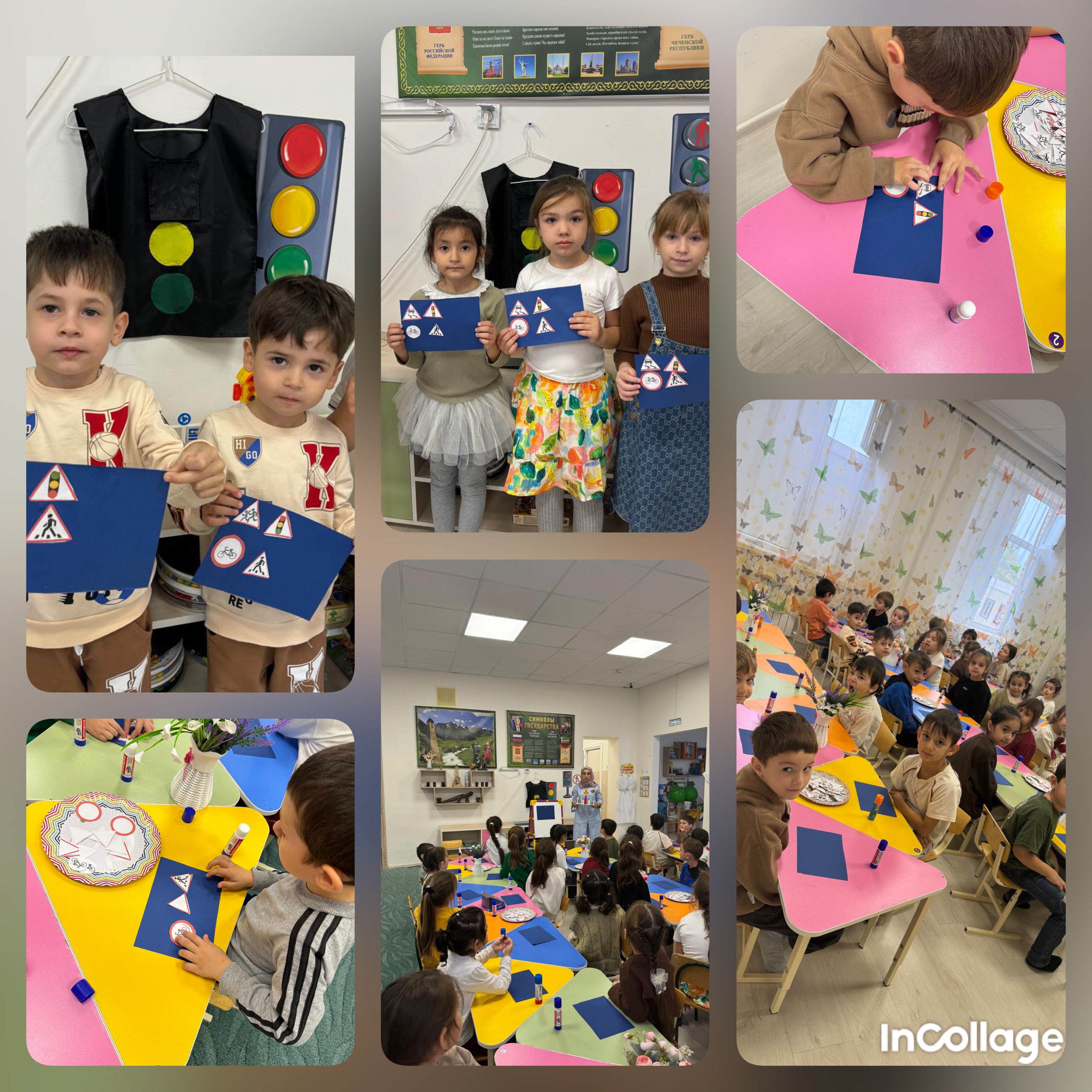 Затем перешли непосредственно к аппликации. Каждый ребенок самостоятельно выбирал, какой сюжет ему больше нравится. Кто-то делал светофор, кто-то пешеходный переход, а некоторые создавали целые картины с машинками, знаками и пешеходами.