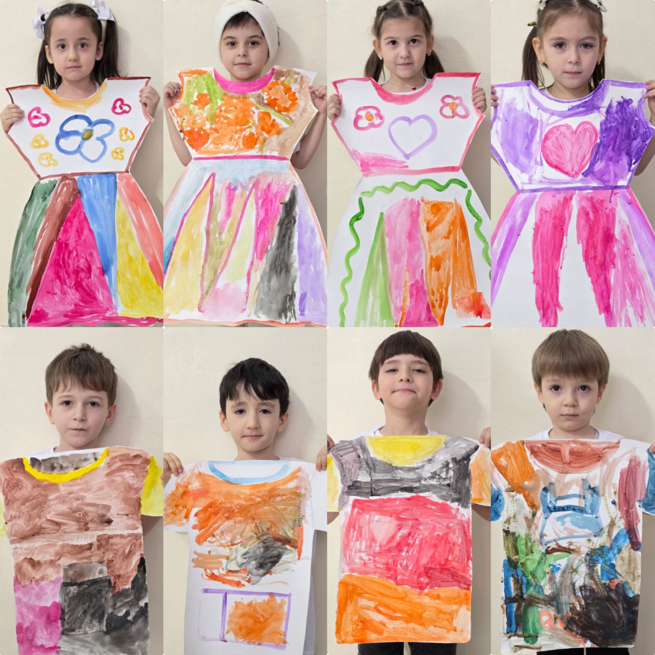 Ребятам были предложены готовые шаблоны одежды на большом ватмане. Вооружившись акварельными красками, наши маленькие модельеры с большим энтузиазмом принялись за работу. Не было никаких правил или ограничений — только pure творчество! Каждый ребенок разрисовал шаблоны так, как подсказывала его фантазия: в яркие полоски, загадочные кляксы или веселые горошины.