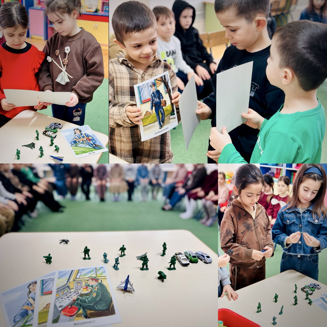Ребята составляли рассказы по набору солдатиков, военной техники и фигурок.