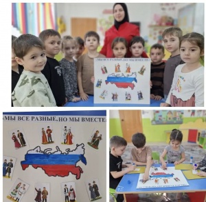 В целях формирования у детей представления о России как о многонациональном государстве, провели коллективную работу: "Россия многонациональная страна " Мы все разные, но мы вместе"