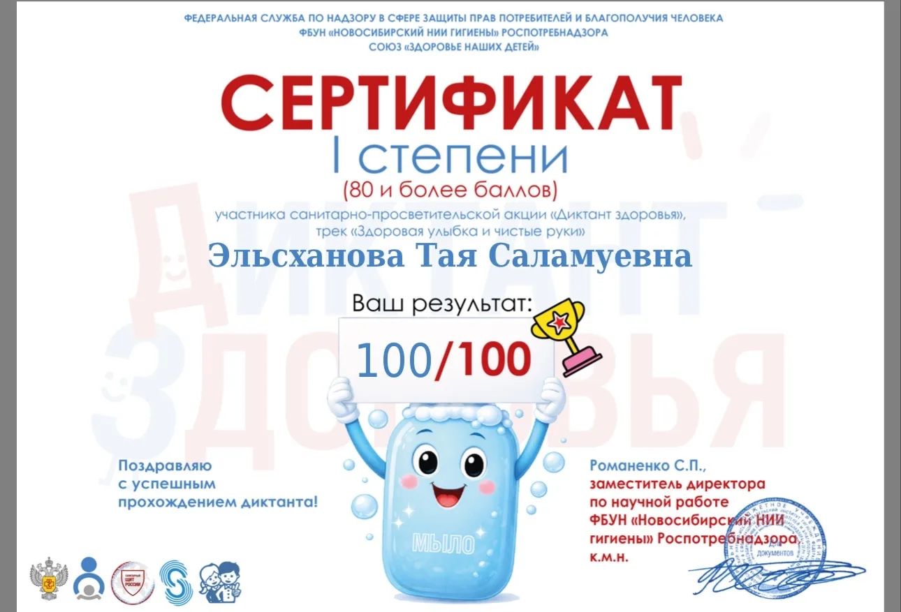 13.04.2026В рамках реализации национальных проектов в сфере здравоохранения и просвещения педагогический состав дошкольных учреждений активно участвует во всероссийских инициативах, направленных на укрепление здоровья и формирование культуры здорового образа жизни.Заведующая МБДОУ «Детский сад «Ясмина» с. Шаами-Юрт» Эльсханова Тая Саламуевна приняла участие в санитарно-просветительской акции «Диктант здоровья» по треку «Здоровая улыбка и чистые руки» и продемонстрировала идеальный результат — 100 из 100 баллов!За высокие знания в области гигиены, профилактики заболеваний и пропаганды здорового образа жизни Тая Саламуевна удостоена Сертификата I степени от Федеральной службы по надзору в сфере защиты прав потребителей и благополучия человека, ФБУН «Новосибирский НИИ гигиены» Роспотребнадзора и Союза «Здоровье наших детей».Руководство детского сада выражает искреннюю гордость за профессионализм, ответственность и личную вовлечённость заведующей в вопросы охраны здоровья воспитанников. Пример Т.С. Эльсхановой вдохновляет весь педагогический коллектив на постоянное совершенствование в вопросах санитарного просвещения и заботы о благополучии детей.